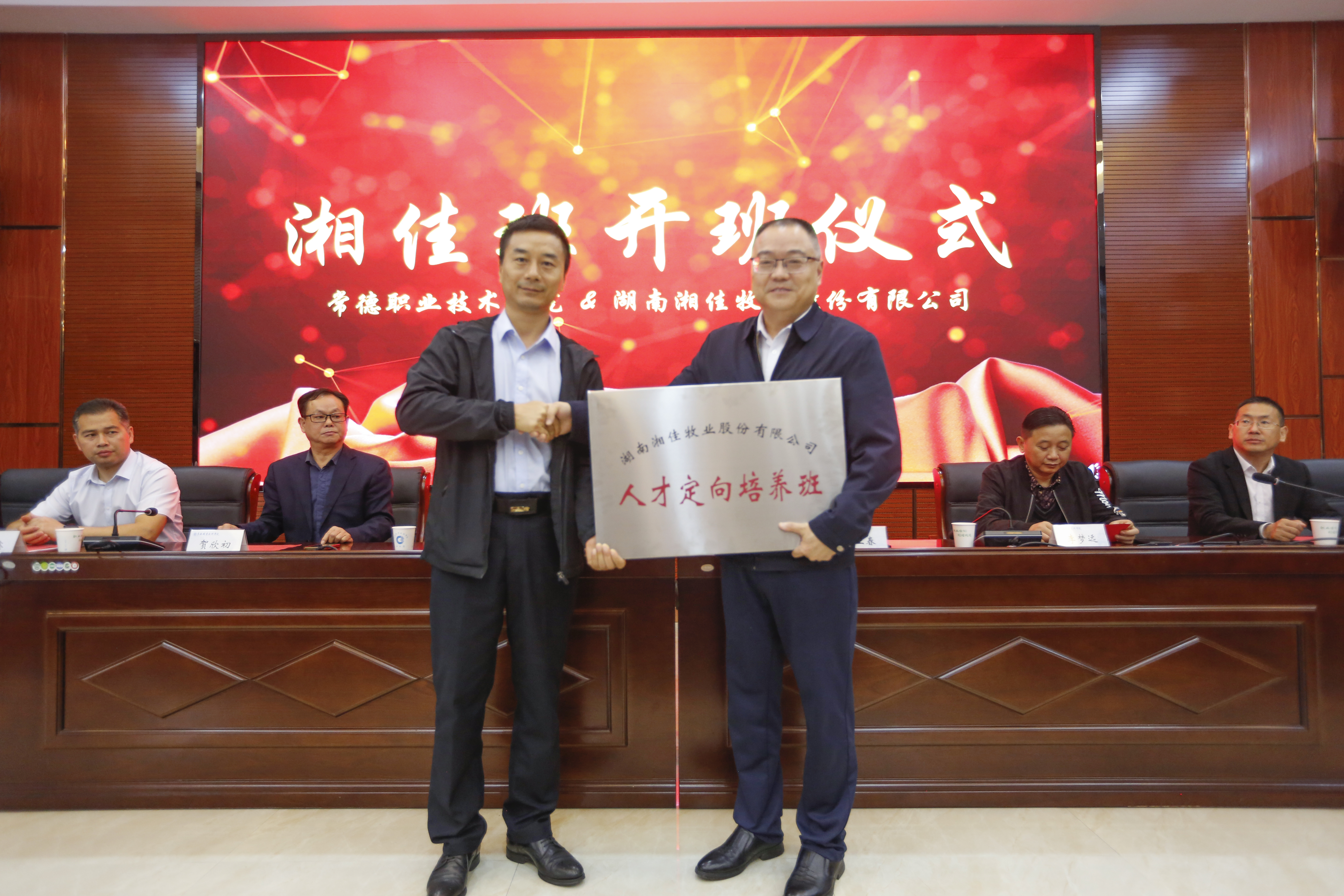 典禮上,何業(yè)春副總裁向常德職業(yè)技術(shù)學(xué)院農(nóng)業(yè)與經(jīng)濟系主任顧振華授“湘佳人才定向培養(yǎng)班”牌,徐翔副書記、何業(yè)春副總裁為班主任唐慧、劉紫薇頒發(fā)班主任聘書,學(xué)院領(lǐng)導(dǎo)為湘佳股份代表頒發(fā)導(dǎo)師聘書。“湘佳班”學(xué)生代表冉家豪上臺發(fā)言。